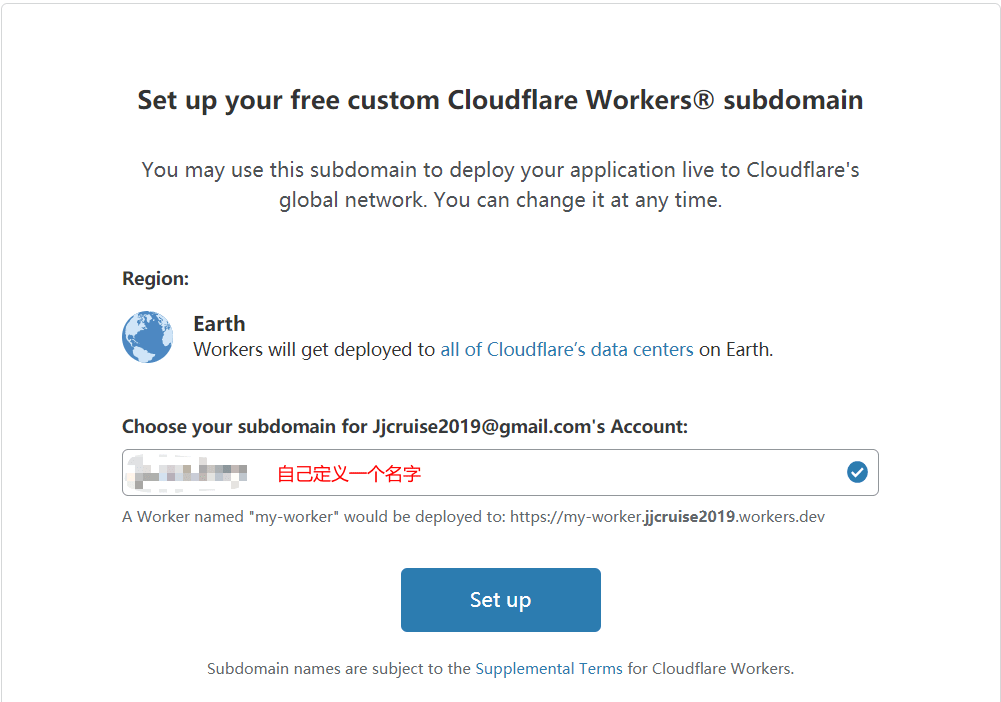 验证完以后重新回到主页,点击右边的Workers,然后定义一个自己的名字,后来会显示在你的访问你的goindex服务的域名中,然后点击Set Up