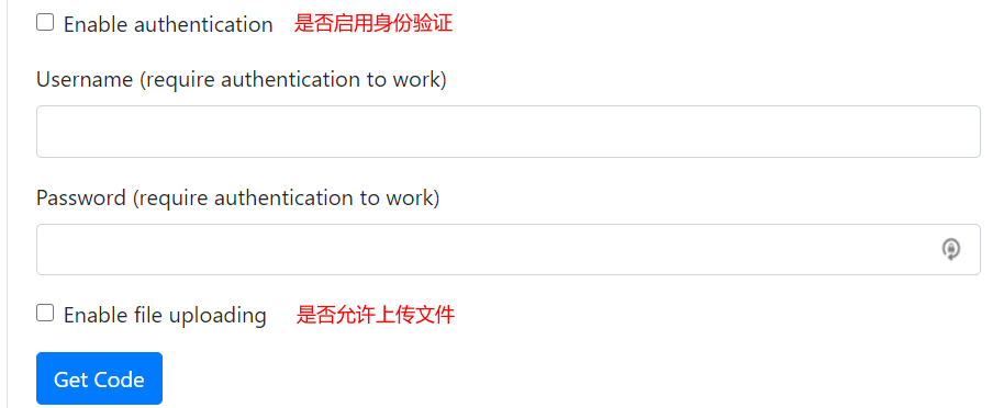 然后接下来的配置就自己选择配置一下就好了,填完以后点击Get Code按钮