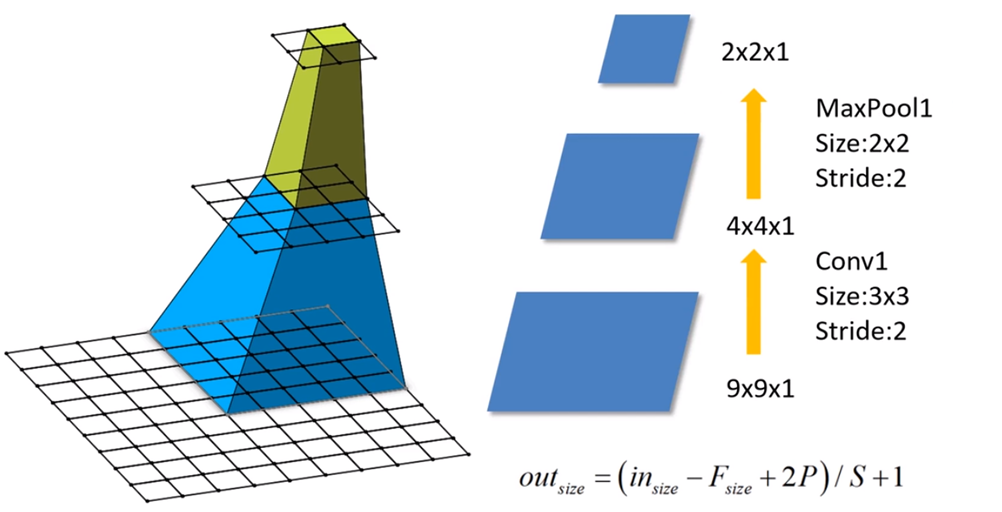 比如在上图中,输出层 layer3 中一个单元对应输入层 layer2 上区域大小为2×2(池化操作),对应输入层 layer1 上大小为5×5。