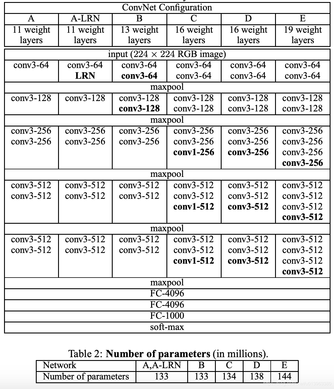 VGG网络有多个版本,各个版本的网络结构大致相同,一般常用的是VGG-16模型,即下图中的D。VGG的网络结构如下图所示: